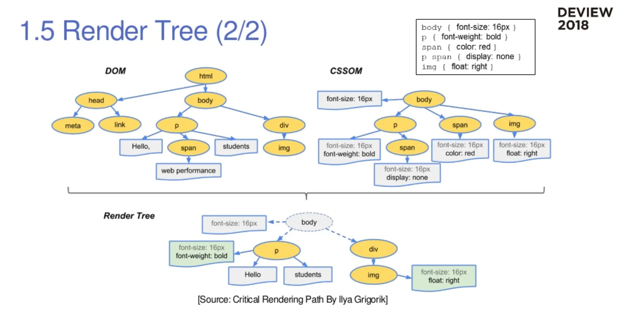 <html>)부터 보여지지 않는 노드(<link>,<script>,<meta>등)를 생략한다. display: none처럼 CSS로 숨겨지는 노드 또한 트리에서 생략한다.- float나 position 같은 속성을 사용했을 경우 흐름에서 벗어나 실제 그려지는 위치로 렌더 객체가 이동한다.